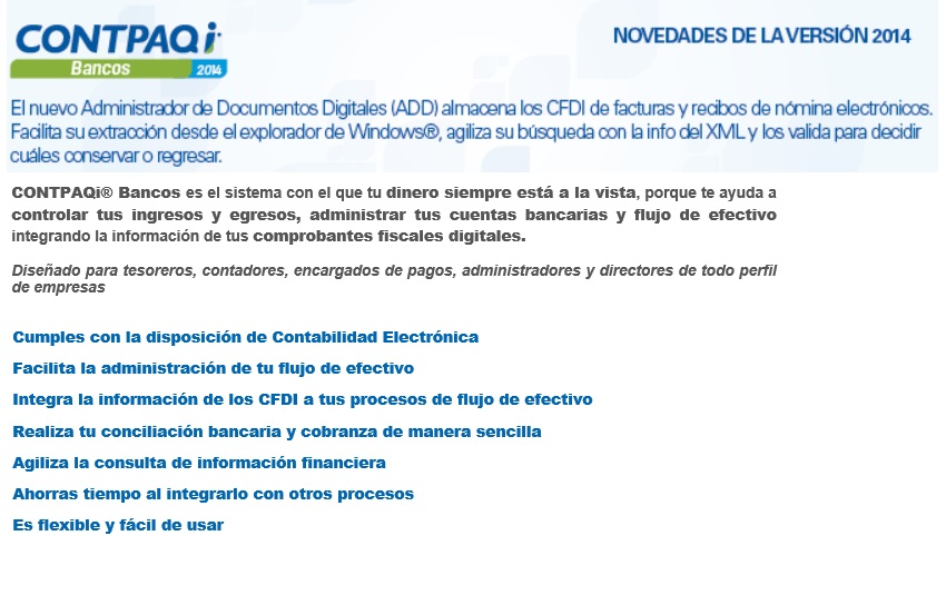 Es el sistema con el que tu dinero siempre está a la vista, ya que te ayuda a controlar tus ingresos y egresos y a integrar la información de tus comprobantes fiscales digitales, facilitando la administración de tus cuentas bancarias y el flujo de efectivo.
