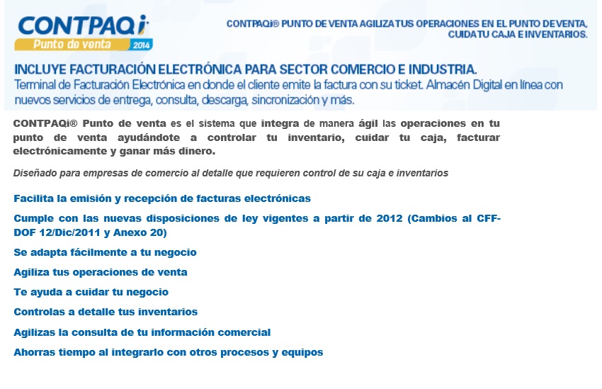 Es el sistema que integra de manera ágil las operaciones en tu punto de venta ayudándote a controlar tu inventario, cuidar tu caja, facturar electrónicamente y ganar más dinero. Diseñado para empresas de comercio al detalle que requieren control de su caja e inventarios