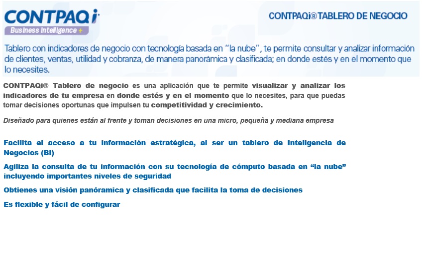CONTPAQi® Tablero de negocio es una aplicación que te permite visualizar y analizar los indicadores de tu empresa en donde estés y en el momento que lo necesites, para que puedas tomar decisiones oportunas que impulsen tu competitividad y crecimiento. Diseñado para quienes están al frente y toman decisiones en una micro, pequeña y mediana empresa